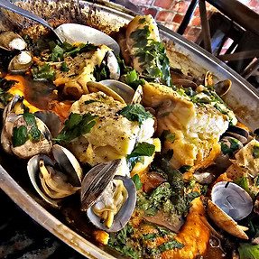 Uma combinação irresistível de lombo de bacalhau e gambas envoltos em um caldo aromático e cozinhados na tradicional Cataplana uma verdadeira viagens de sabores