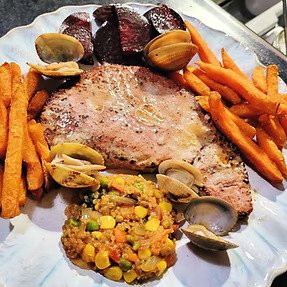 Atum brazeado com ameijoas e Caju