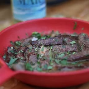 Um bife da vazia de 300 gr envolvido num molho á chefe com ovo estrelado