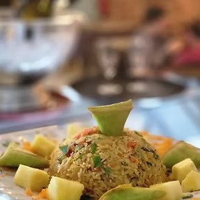 Um arroz com com o filete de Robalo enriquecido com camarão e ameijoas e perfumado com coentros com um toque de frutos secos